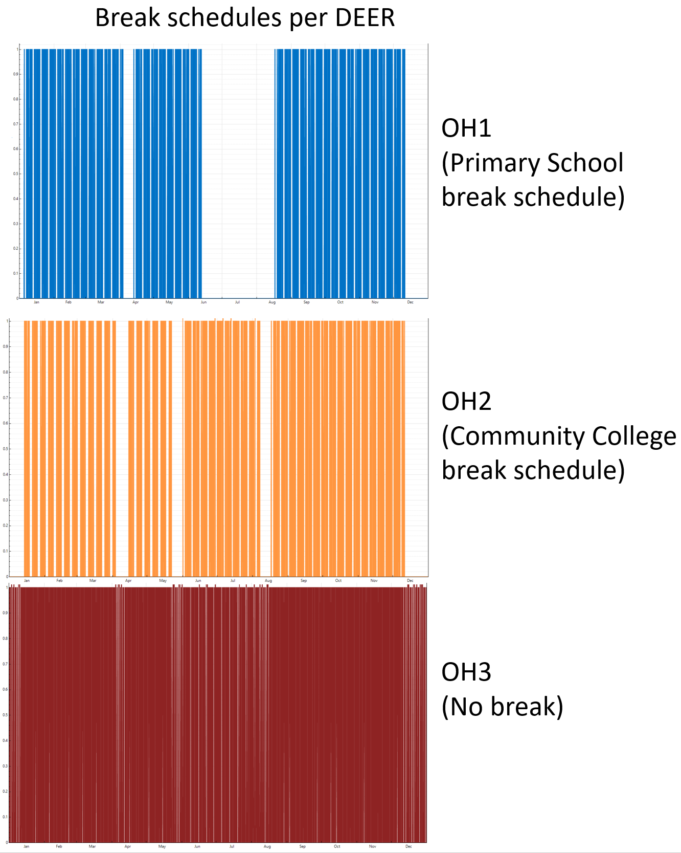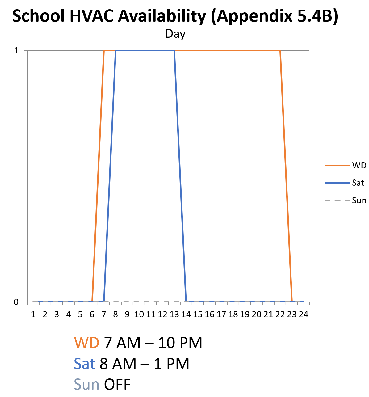 The School schedule group is modified from the original hourly profiles in Appendix 5.4B to represent typical primary school (short), community college (average), and university (long) schedules. The hourly/daily schedules are the same as Appendix 5.4B, however seasonal variations are incorporated to represent breaks for the three different school types.