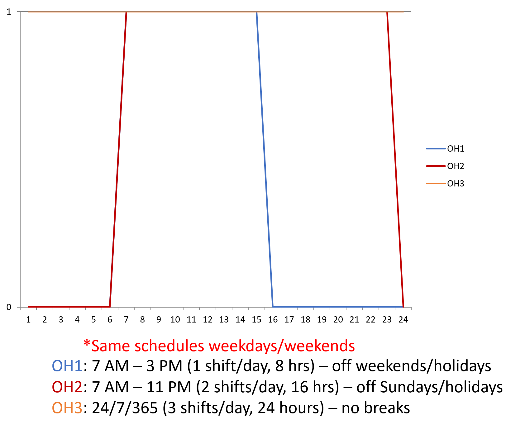 The Warehouse schedule group is modified from the original hourly profiles in Appendix 5.4B to represent one, two, and three shifts per day, corresponding to short (OH1), average (OH2), and long (OH3) schedules, respectively. The daily schedules remained consistent throughout the year.